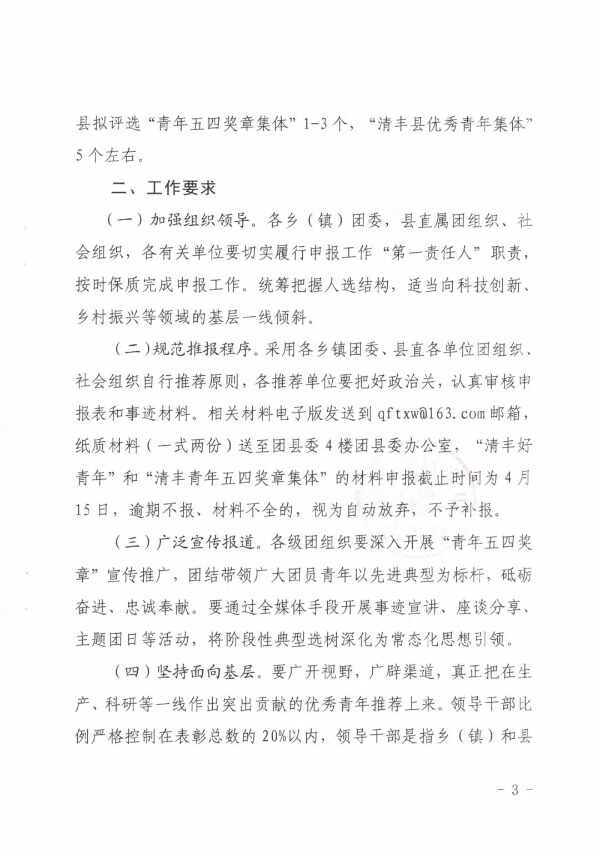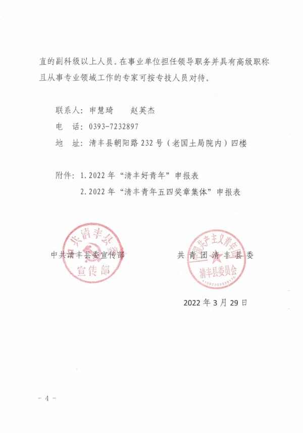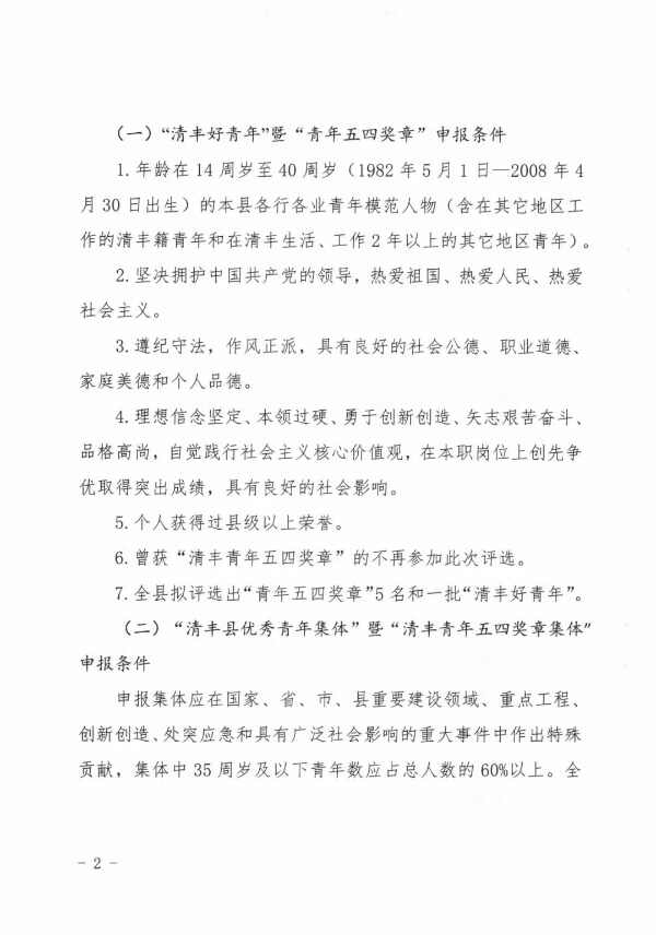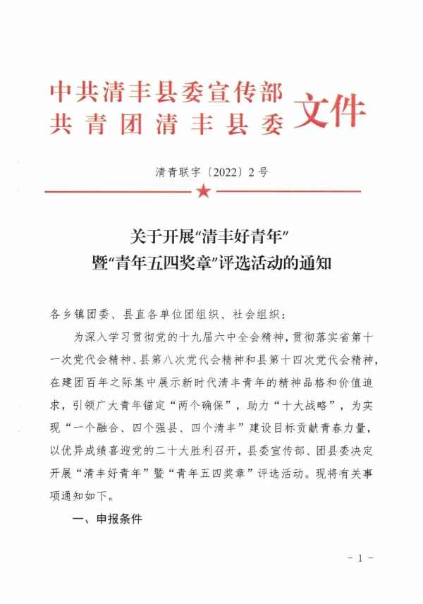 在建团百年之际,为集中展示新时代清丰县青年的精神品格和价值追求,引领和鼓励青年永远跟党走、奋进新征程,以优异成绩迎接党的二十大胜利召开,团县委决定开展“清丰好青年”暨“青年五四奖章”评选活动。现将有关事项通知如下: