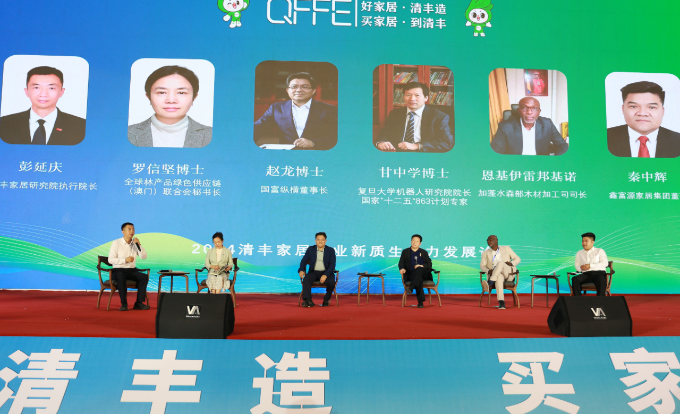 论坛最后,清丰家居研究院执行院长彭延庆与复旦大学机器人研究院院长甘中学,加蓬水森部木材加工司司长恩基伊雷邦基诺,全球林产品绿色供应链(澳门)联合会秘书长罗信坚,国富纵横董事长赵龙,鑫富源家居集团董事长秦中辉共同围绕加蓬及国际国内原材料生产、物流、贸易及发展前景;家居产业智能制造、适老化创新及应用前景;企业营销策划、品牌包装及产品推广策略;产品创新及企业经营心得等话题进行现场访谈对话。