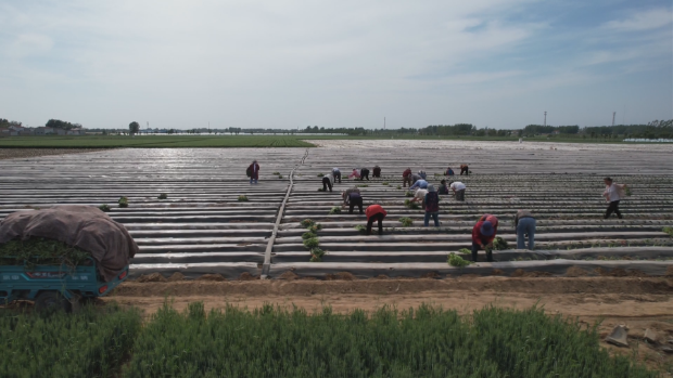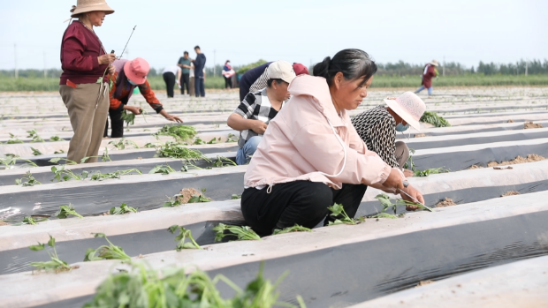 工人  殷贵仙:我在这栽红薯,覆苗,一天挣50块钱,反正就这都够我吃的了。