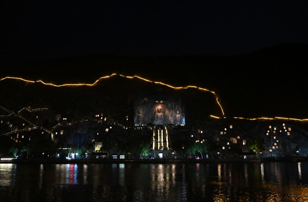 2025年4月24日,游客在龙门石窟夜游。 以文塑旅 以旅彰文 龙门石窟是河南向游客讲好 “诗与远方”故事的一个窗口 立足丰富的文脉资源 不断创新文化体验表达 “老家河南”正奋力谱写 文旅融合高质量发展的新篇章