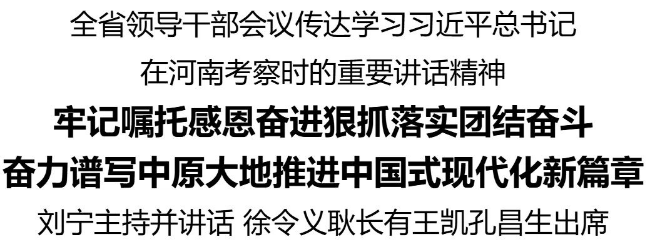 5月23日,全省领导干部会议召开,传达学习习近平总书记在河南考察时的重要讲话精神。省委书记刘宁主持会议并讲话,强调要以高度的政治自觉、思想自觉、行动自觉,全力抓好学习宣传贯彻各项工作,牢记嘱托、感恩奋进、狠抓落实、团结奋斗,凝聚起全省上下强大合力,奋力谱写中原大地推进中国式现代化新篇章。深入贯彻中央八项规定精神学习教育中央第二指导组组长徐令义、中央第五巡视组组长耿长有、省长王凯、省政协主席孔昌生出席会议。