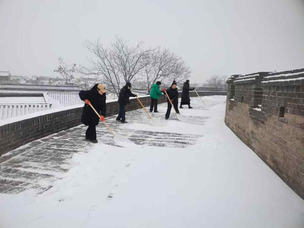 清晨6点,平遥古城的城墙上已是一番忙碌景象。全程6公里多的环线上,工作人员手持扫帚、铲子,正细心地清扫青砖上的积雪。