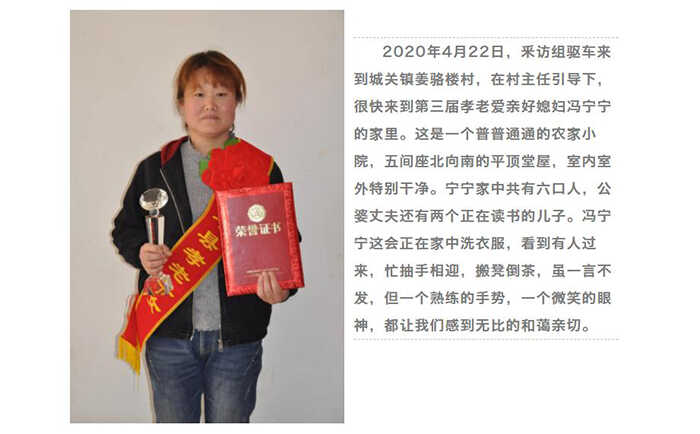 冯宁宁现年38岁,娘家是相距不远的黄骆楼村。8岁那年,因患小儿麻痹高烧失去了听力,虽得到政府多次救助,最终成为聋哑。她10岁进入清丰福利综合院学哑语,三年后能简单地写一些汉字。因她心灵手巧,各种家务一见便会。21岁经人介绍,嫁到姜骆楼,与姜红波结为夫妻。婆家虽穷,但为有一个能吃苦耐劳的丈夫,总感觉无比的幸褔。新的生活刚刚开始,不幸的是婆婆王凤阁突患脑血栓和股骨头坏死,变成了半啦植物人。公爹为此抓耳挠腮,一是花钱看病,二是伺候照顾,三是儿媳冯宁宁身怀六甲,愁得他差点没有躺倒。宁宁虽是女辈,但她内心十分坚强,常用手语劝告公爹:家中没钱,让红波去挣,家里的一切,全交给儿媳!就是这样,大小事让宁宁做主,公爹姜庆珍这才挺起了胸脯。冯宁宁虽腆着大肚子,照样刷锅做饭,洗衣晒干,给婆婆洗脚,擦澡,梳头,遇到好天气就推着轮椅让婆婆晒太阳。由于婆婆便秘,三天两头去商店购买水果,洗净之后,再用小刀一点一点将外皮削掉,一点一点切成小片放到婆婆嘴里。有一天宁宁陪护婆婆久了,两人都不知不觉睡着了,公爹姜庆珍不放心,摄手摄脚想进去看一下,因好长吋间没有理发刮脸了,刚进门,宁宁突然坐起,发呆地望着公爹好一阵,而后两手往下一垂,意思是说,爹呀,您老把我吓了一跳。第二天,宁宁从邻居家借来了剃头剪刀等,亲手为公爹理起发来。边理发,姜庆珍边流泪,自言自语地说,想不到儿媳还有这手艺。其实这是生活逼出来的,别说没有学过,就是专业的女理发师,能有几人为公爹亲手理发的,能摊上这样的好媳妇,真是上辈子老人家行好积来的福呀!没过多久,姜庆珍让儿子买了一套理发工具,全家人理发,都包给了宁宁一个人。