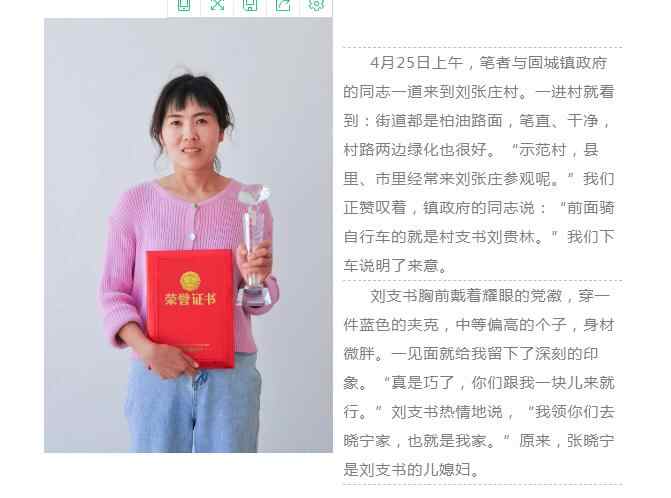 “2015年,因为风湿病引起皮肤溃烂,在石家庄和平医院住院治疗20多天,晓宁伺候了20多天。医院里的护士夸她‘你们的女儿真孝顺!’她们把儿媳妇当闺女啦。”刘支书笑着说,“另外,我近90岁高龄的老母亲也要晓宁伺候。老母亲虽然身体还行,但毕竟岁数大了,行动不便,晓宁跑前跑后,照顾很周到。做饭时,经常问问她奶奶想吃什么。上了岁数的人,牙口不好,晓宁就做松软的、易消化的饭菜。常常给她奶奶梳头、捶背、洗脚,陪她奶奶说说话。我老母亲逢人就夸孙媳妇孝顺呢。”