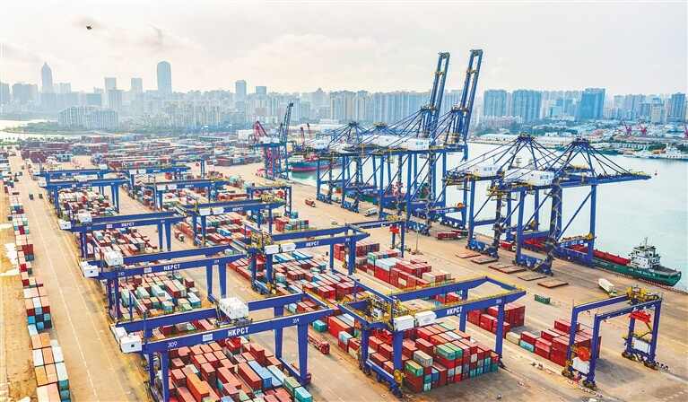 资料图:海口港集装箱码头一片繁忙。来源:海南日报