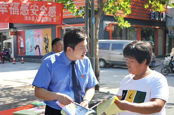 扫黑除恶专项斗争开展以来,清丰县人民检察院高度重视、积极安排部署。为扩大扫黑除恶专项斗争影响、鼓舞群众积极参与,2018年8月28日,院党组书记、检察长王克臣带领部分班子成员及党员干警一行来到金桥商业街、清华社区开展扫黑除恶专项斗争集中宣传活动,增强人民群众对扫黑除恶专项斗争工作的认同感,全力提升群众的安全感和满意度。