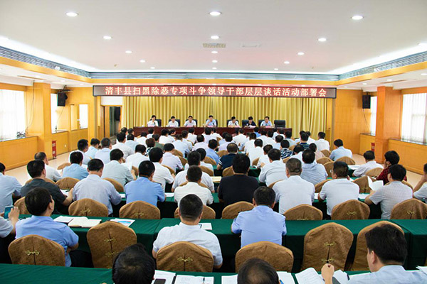 9月13日上午,清丰县召开扫黑除恶专项斗争领导干部层层谈话活动部署会议。会议主要任务是贯彻落实中央扫黑除恶第6督导组与河南省委第一次工作对接会要求,进一步宣传学习习近平总书记重要指示精神和中央、省委、市委决策部署,提高各乡镇和行政村、县直各单位党员干部对扫黑除恶专项斗争的认识,压实主体责任,抓好贯彻落实,推动扫黑除恶专项斗争工作向纵深发展。