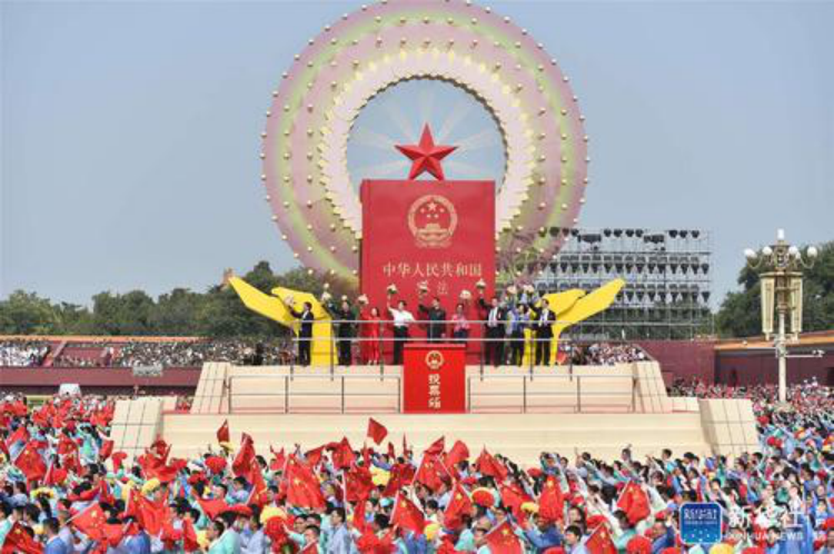 70年大庆中,政法英模登上“民主法治”彩车,经过天安门。(图:新华社)