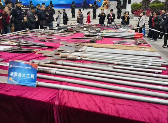 梧州公安向公众展示专项斗争中收缴的涉案暴力工具。