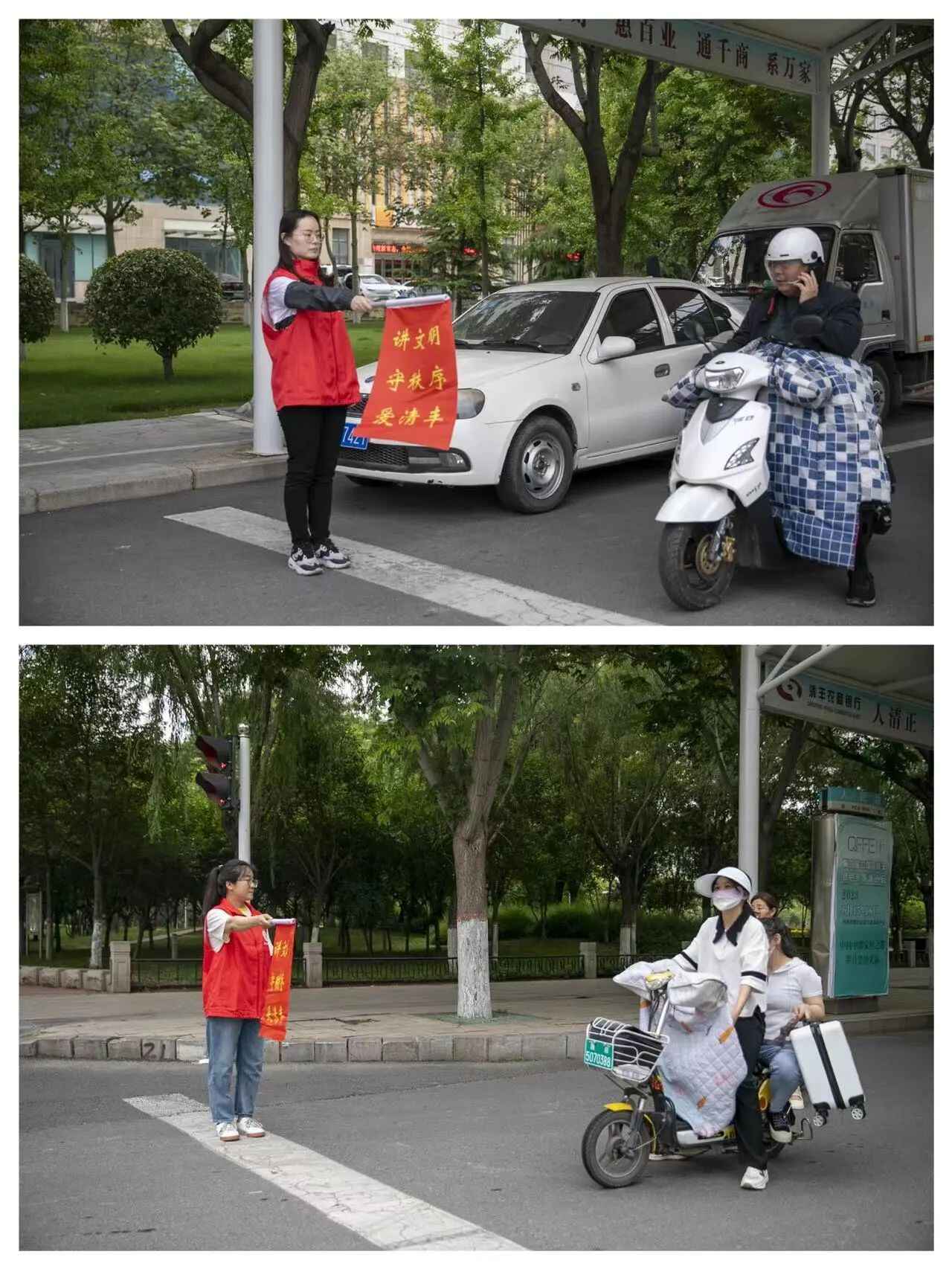 宣传部的志愿者们矗立在各自的值班点位,认真履行文明交通志愿者职责。他们对闯红灯等不文明行为进行耐心劝导,一句句温馨提示换来一次次的支持和改变。在解释工作中,他们还举一反三、防范未然,告诫行人严禁横穿马路、车辆不礼让行人、行人不戴、随地丢垃圾等不文明行为。