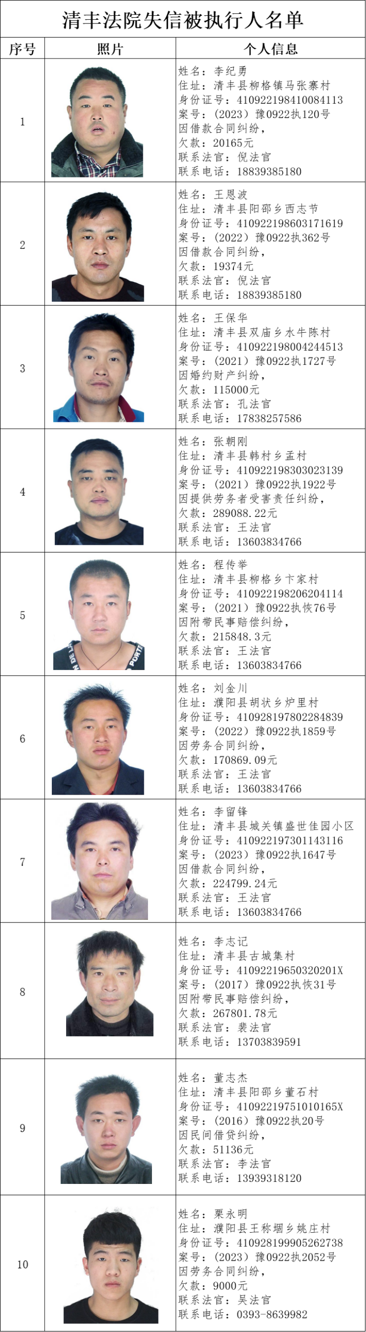 清丰法院曝光 失信被执行人名单