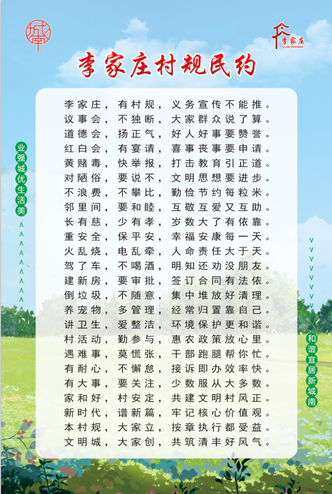 “邻里间,要和睦;互敬重,常帮扶……”一走进清丰县城南街道的行政村和社区,就能在醒目位置看见朗朗上口的《村规民约》和《居民公约》。近日,城南街道办围绕法治保障、乡风文明、德治教化、自治强基等方面,制订了浅显易懂的《村规民约》《居民公约》三字经,普及法律法规共同遵守、移风易俗破旧迎新、文明行为你我同行、和谐村(社区)人人共建等新风尚,旨在通过潜移默化、润物无声的形式,不断增强居民法治意识和安全意识,提升群众文明素质,共建文明幸福、和谐美丽的新城南。