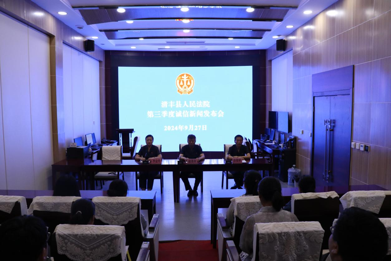 9月27日,清丰县法院召开2024年第三季度执行工作暨诚信建设新闻发布会。清丰县法院党组成员、副院长侯美中,执行局局长李金玲出席发布会,发布会由党组成员、政治部主任佘俊林主持,发布会邀请县融媒体中心媒体记者参加。