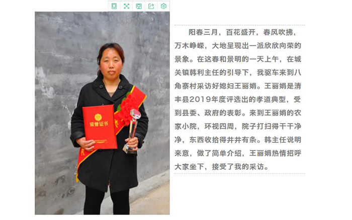 就在采访快要结束时,王丽娟的婆婆贾梅双与一个邻居从外边回来,二人对笔者滔滔不绝地夸起王丽娟。邻居卢景花说,丽娟识书达理,有涵养,孝敬长辈,相夫教子。与邻居和睦相处,从不说三道四搬弄是非。乐于助人,是我们村里大家公认的好媳妇。婆婆贾梅双说,从结婚到现在二十多年了,俺丽娟从不叫我洗碗刷锅,吃饭把碗给我端跟前,带我看病,洗澡,什么也不叫我干。前年500多块给我买了一件棉袄。我说老婆子穿那么好棉袄干啥,冻不着就中了。你猜俺丽娟说啥,说越老越要打扮,那叫老来俏。俺丽娟这个儿媳妇比亲闺女还好,把俺当成了亲妈。
