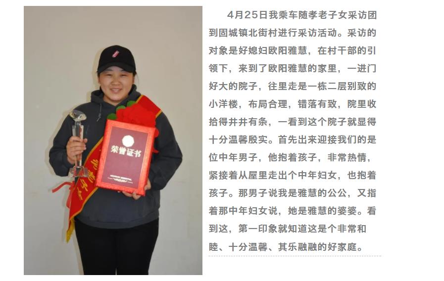 等采访结束,从她家出来时,村干部夸赞说,这真是个好媳妇,和睦邻里,心地善良,勤奋上进,又有礼貌,孝顺老人,乡邻都夸她是一个有修养的好媳妇。也是她家风的传承者。