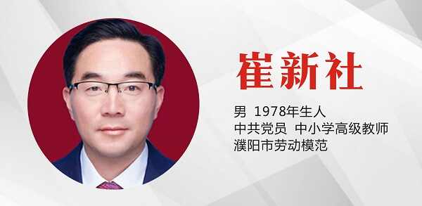 崔新社,男,1978年生人,中共党员,中小学高级教师,濮阳市劳动模范。2002年任教以来,始终坚守地理教学一线,一直担任班主任工作,现兼任华中师大清丰附中2019级年级主任。在学生眼中,他心中有爱、眼中有光;在家长眼中,他业务精湛、敬业奉献;在领导眼中,他总能以校为家、能挑重担。曾获濮阳市优秀教师、濮阳市师德先进个人、濮阳市优秀班主任、濮阳市优质课教师等20余项市级荣誉称号。