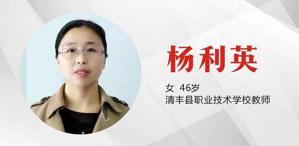 杨利英,女,46岁,清丰县职业技术学校教师。她执着坚守,乐于奉献。从教26年,任班主任20载,爱生如子、大爱无疆,用爱点灯照亮学生前行的路。她潜心教学,匠心育人。积极参加业务培训,力学笃行,教学风格独特,同行称道,学生夸赞,课例多次在省市获奖,辅导学生在省市大赛中成绩斐然。她辛勤耕耘,硕果累累!先后荣获河南省学术技术带头人、市学科带头人、市师德先进个人、市优秀班主任、市优质课一等奖、市优秀科技教师等称号。