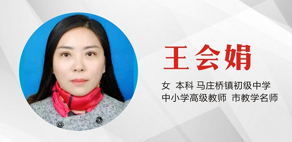 王会娟,女,本科,中小学高级教师,市教学名师。1999年9月至今任教于马庄桥镇初级中学。参加工作以来,王会娟无私奉献,为人师表,全面贯彻党的教育方针,积极实施素质教育,教学成绩突出。先后获得国家、省、市、县级优质课奖励二十余次;发表教育论文20余篇,其中在《中学生阅读》、《快乐作文》、《濮阳日报》、《河南教育报》发表教研文章多篇;辅导学生发表文章多篇,连续七年教师年度考核优秀。先后被评为“县最受学生喜爱的老师”、“县五一劳动奖章”、“清丰县优秀教师”、连续八年荣获“县优秀班主任”、“市优秀班主任”“市级文明教师”、“市级师德先进个人”、“市级教学标兵”“省级优秀辅导教师”、“河南省优秀教师”等荣誉称号。