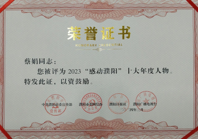 近日,由市委宣传部、市委网信办、濮阳日报社、市广播电视台联合主办的2023“感动濮阳”十大年度人物揭晓,清丰县司法局蔡娟同志榜上有名。