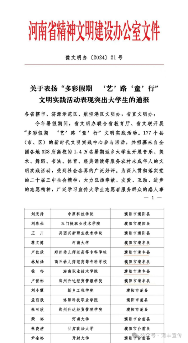 2024年河南省“多彩假期‘艺’路‘童’行”文明实践活动由省文明办、省教育厅、省文联联合举办,旨在丰富农村未成年人暑期文化生活,丰富大学生社会实践阅历。县委宣传部、县文明办高度重视,联合县教育局、共青团清丰县委,采取发布网络招募公告,召开会议安排部署,组织培训提升技能,加强指导保障质量,做好宣传扩大影响五项措施,推动活动取得实效。22名多才多艺的暑期返乡大学生利用6天时间到5所乡村学校少年宫同步开展音乐、体育、美术、舞蹈、书法、经典诵读等文明实践活动,受益学生达2400余人次,受到家长广泛好评。