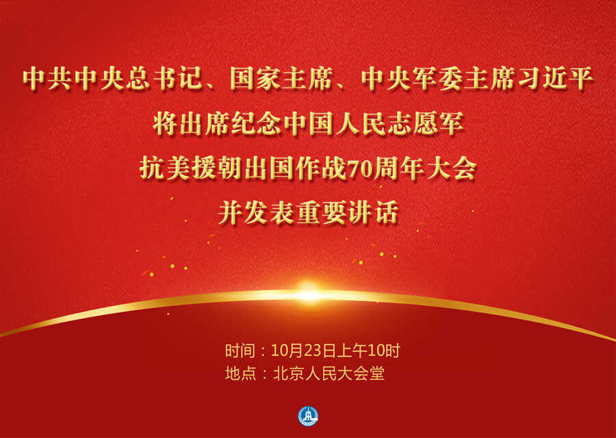 新华社北京10月21日电 纪念中国人民志愿军抗美援朝出国作战70周年大会将于23日上午10时在北京人民大会堂隆重举行。中共中央总书记、国家主席、中央军委主席习近平将出席大会并发表重要讲话。