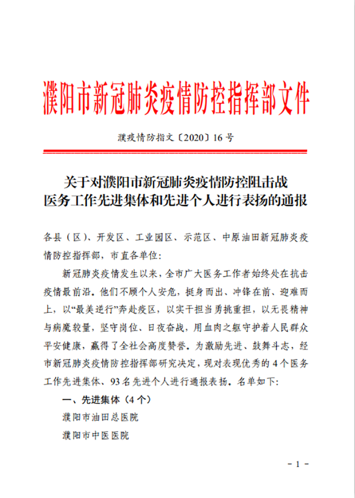 濮疫情防指文〔2020〕16号关于对濮阳市新冠肺炎疫情防控阻击战 医务工作先进集体和先进个人进行表扬的通报