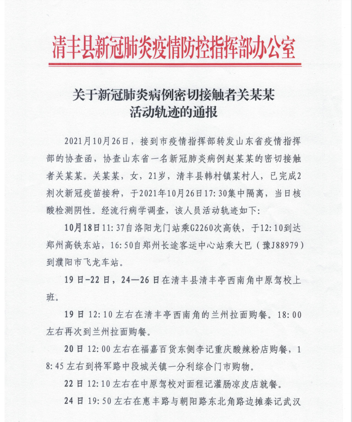 关于新冠肺炎病例密切接触者关某某活动轨迹的通报