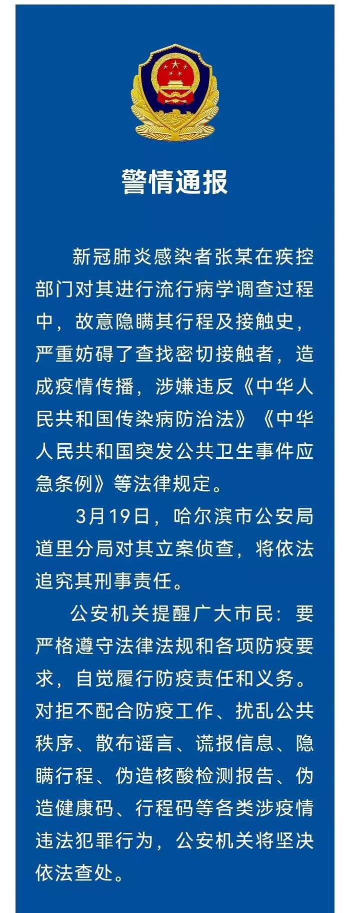 3月19日,哈尔滨市公安局发布警情通报,对故意隐瞒行程及接触史的新冠肺炎感染者张某立案侦查。