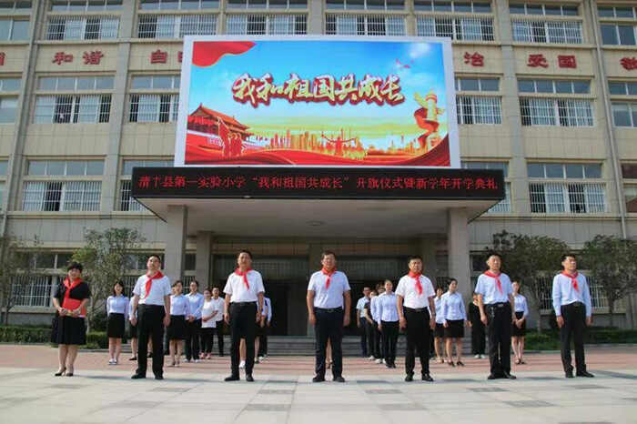 “我和祖国共成长”升旗仪式暨新学年开学典礼。县委常委、宣传部部长李善戎、县委宣传部主任科员徐社军等领导与县第一实验小学本部4000名师生共同参加仪式。