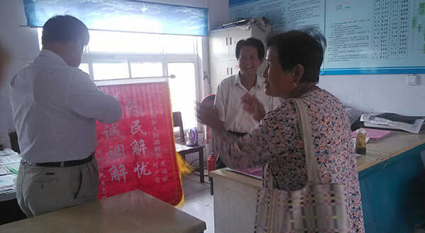 6月3日,罗寨村村民王志强夫妇手拿锦旗来到六塔乡党委副书记郝振宇的办公室要找为他们精诚调解的人民调解员晁海献、刘少贡二人,送上锦旗表示感谢。