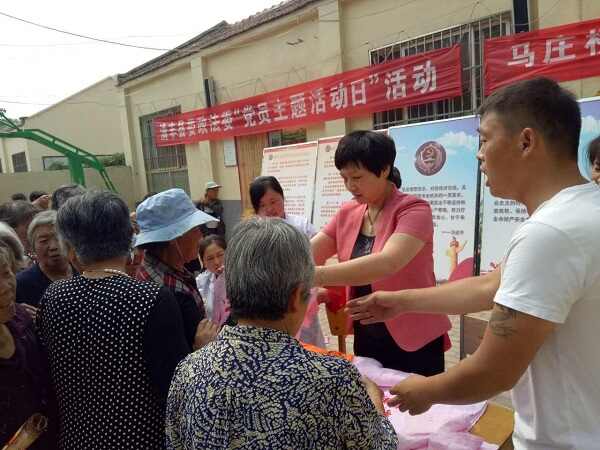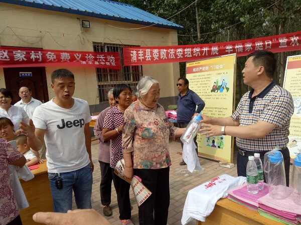 县政法委书记惠晓杰、马庄桥镇党委书记蒋智敏为困难群众和党员发放水杯和文化衫等礼品300多件,发放平安建设和精准扶贫宣传材料500多份。同时,开展免费义诊活动,县中医院院长李西方同志带领中医院9名专家为300多名村民免费义诊,给群众送来党的关怀和温暖,得到群众一致好评。