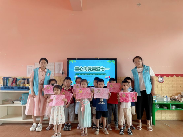 为追寻党的奋斗足迹、铭记党的光辉历程,激发幼儿爱党、爱国的真挚情怀,社工们组织孩子们画出“心中的党旗”,绘出一幅幅惟妙惟肖的画作,每幅画都在表达对党和国家的祝福。