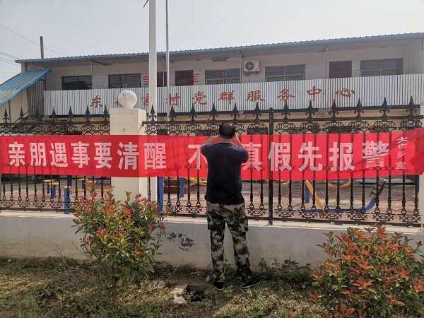 各村在人员密集和重点位置张贴悬挂反诈标语、海报、利用电子显示播放反诈宣传片,将反电诈的信息传递到群众中间,提醒广大群众“谨防电信诈骗,绷紧防范之弦”。
