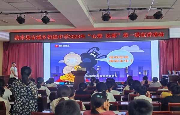 为进一步做好广大中学生的“心理 反邪”教育工作,切实增强广大学生知道知识的重要性,并充分认识邪教的本质及危害,增强广大师生识别邪教,抵制邪教的能力,促进校园文明、平安、和谐、稳定发展,2023年9月13日上午,古城乡联合县政法委走进古城乡初级中学开展了《2023年“心理 反邪”第一课宣讲活动》。