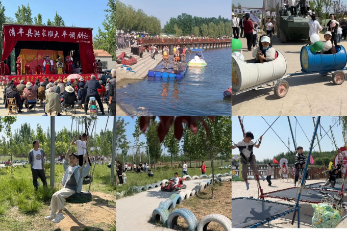 戏剧社团精彩演出吸引了众多老人前来观看,展现出了中国戏曲的多彩风貌,赢得了台下观众的阵阵掌声;湖上游船赢得最多喜爱,大家排队有序登船,民兵连的同志们组成紧急救援队,时刻保障人身安全,让游客安心在船上赏景、拍照、戏水;恒忧户外拓展基地组织儿童书法大赛,荡秋千、小火车、卡丁车、坦克车等诸多游乐设施广受欢迎,寓教于乐,效果满满,充满小朋友的欢声笑语;还有蹦床、充气城堡、捞小鱼、绘画、打枪等项目,使游客们流连忘返。