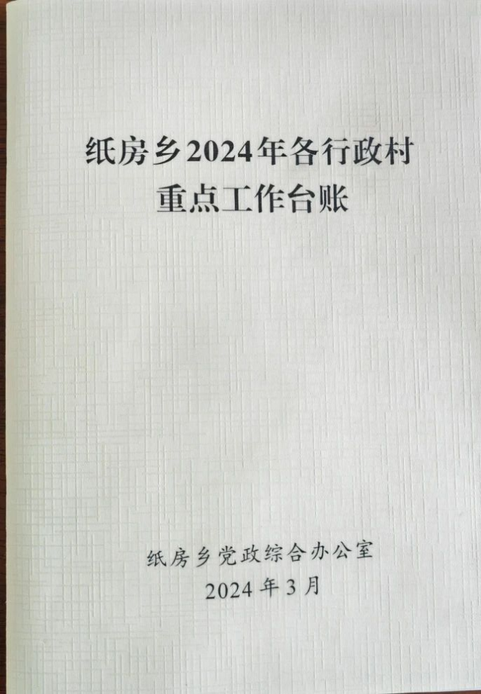 立足实际,制定台账。建立《纸房乡2024年各行政村重点工作台账》,聚焦各村党员群众所盼,收集大事实事67件,涵盖道路硬化、村室提升等内容;结合村情实际,制定集体经济发展措施59条,确保年内各村集体经济收入达到5万元以上。