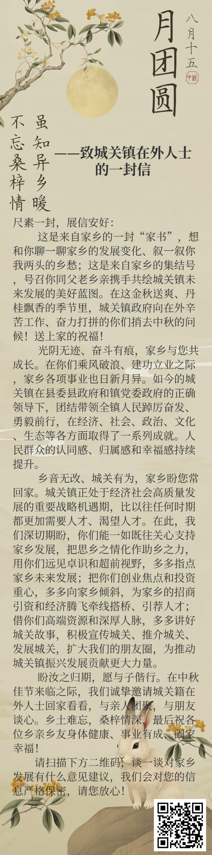 一是写一封温情“家书”。在微信群、朋友圈广泛传播《致城关镇在外人才的一封信》,介绍家乡发展近况,邀请他们在招商引资、家乡建设、经济发展上共同讲好城关故事。随信设置二维码,收集在外人才信息与意见建议,为进一步联系打好基础。