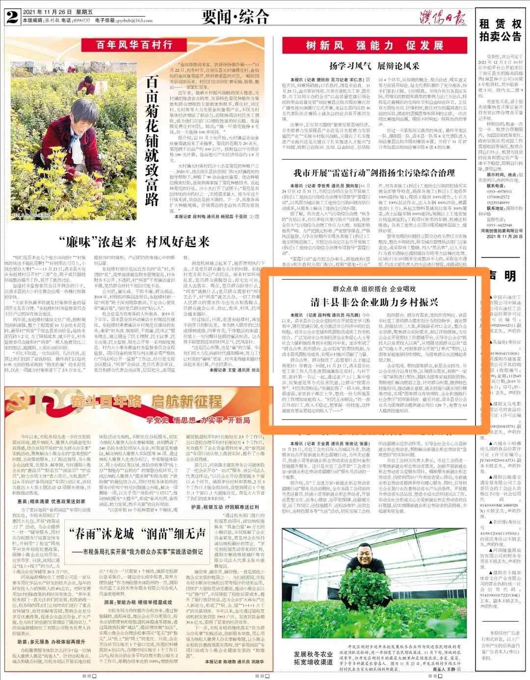 11月26日,濮阳日报以《群众点单、组织搭台、企业唱戏》为题,刊发清丰县非公企业助力乡村振兴特色做法。