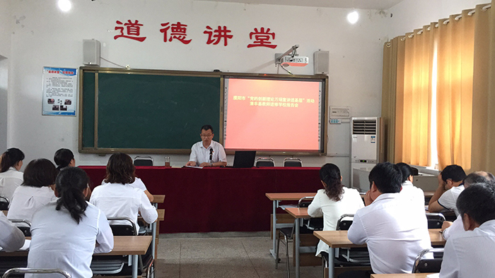 7月8日上午,在学校一楼会议室,清丰县教师进修学校举行“党的创新理论万场宣讲进基层”报告会,学校党支部书记闫战民作了题为《做好习近平新时代中国特色社会主义新思想的宣传者和实践者》报告,报告会从学习十九大报告精神入题,讲述了自己对学习十九大报告的深刻理解,阐述了“八个明确”和“十四个坚持”的内容,理论结合自身故事,既生动又有趣,学校教职工受益匪浅。