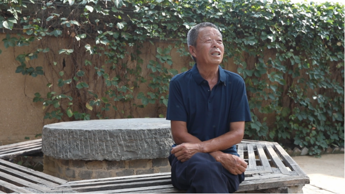 67岁的村民陈希琢站在展柜前