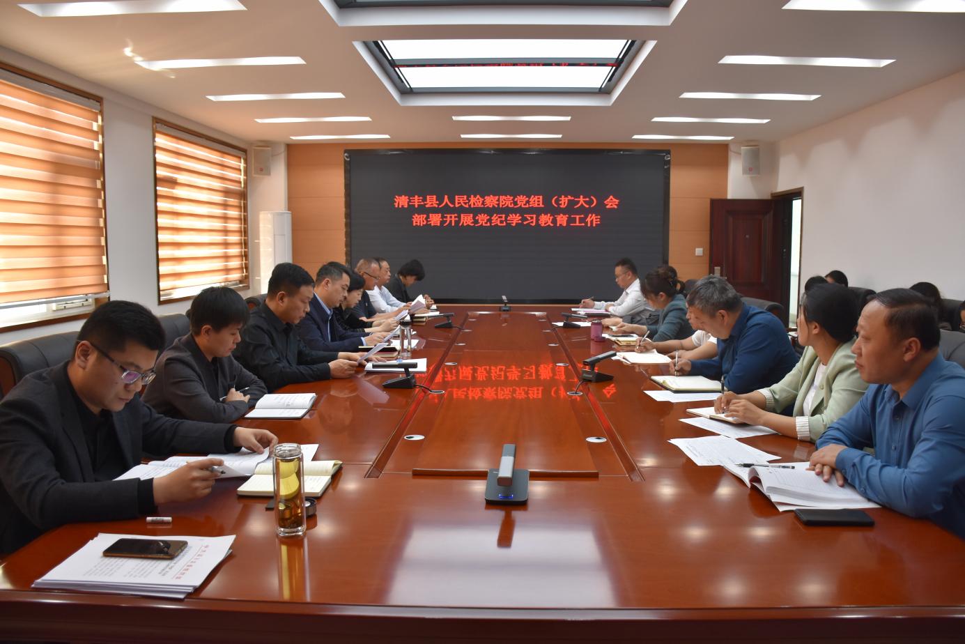4月15日,清丰县人民检察院召开党组(扩大)会议,传达学习习近平总书记关于党纪学习教育的重要讲话和指示精神,学习贯彻中央、省委、市委、县委关于党纪学习教育的部署安排,结合清丰检察实际,研讨梳理贯彻落实举措。会议由院党组书记、检察长杨斌主持,院党组成员、专职委员及各部室负责人参加。