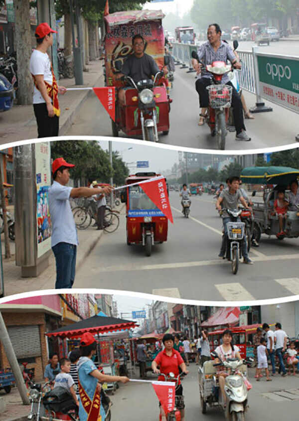 7月31日上午,团县委协调20余个县直单位召开了文明交通志愿服务活动动员会,对该项工作进行了说明讲解和责任分工,并邀请县公安局交警大队副大队长姚彦民对青年志愿者进行了岗前培训。8月1日上午,组织县财政局、县审计局、县质监局、县民政局和县科技局等5个县直单位的20名青年志愿者走上街头,开展交通文明志愿服务活动。青年志愿者们头戴“青年志愿者”小红帽,身披“青年志愿者”绶带,手持“文明礼让”小红旗,4人一组分别站在朝阳路与政通大道交叉口、与南箕街交叉口、与凤鸣路交叉口,和文化路与政通大道交叉口、与南箕街交叉口等5个重要交通路口,积极协助交警开展文明交通劝导工作。他们耐心向过往行人讲解文明交通知识,劝阻闯红灯、不按信号灯指示行驶等各种不文明交通行为,共同维护良好的交通秩序。