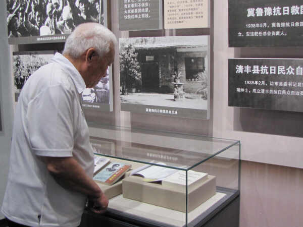 图2,老同志们虽已年逾八旬,他们完全忘记了疲惫,或在某一历史资料前凝神矗立神情凝固,或被眼前的资料带回历史的记忆而潸然泪下,重温着抗日战争的悲壮历史,使老同志对今天国家的发展和复兴感到由衷的欣慰。
