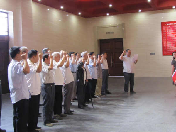 图1, 在纪念馆展厅里,踏着这片革命前辈曾经生活战斗过的地方,面对鲜红的党旗,老同志们重温了入党誓词,坚定地表达了老党员爱国爱党的信念。