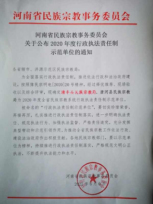 为全面落实行政执法责任制,推进依法行政和法治政府建设,按照豫民宗明电〔2020〕20号精神,经过择优推荐、现场验收以及综合评审,清丰县民族宗教局被评为2020年度全省民族宗教系统行政执法责任制示范单位。