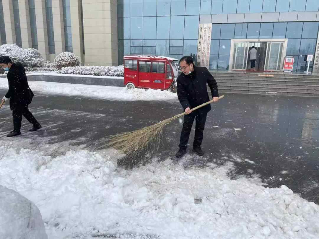 1月22日,清丰县普降大雪,为了营造一个干净整洁的工作环境,县委县政府督查局及早安排,组织全体干部职工清扫企业服务中心周边积雪。