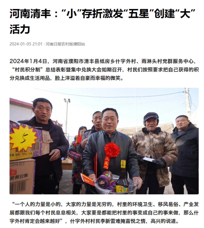 2024年1月4日,河南省濮阳市清丰县纸房乡什字外村、雨淋头村党群服务中心,“村民积分制”总结表彰暨集中兑换大会如期召开,村民们按照要求把自己获得的积分兑换成生活用品,脸上洋溢着自豪而幸福的微笑。