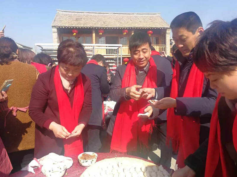 县人大常委会主任杨理宏,县政协主席戚士杰,县委常委、宣传部长岳春青,县人大党组副书记、总工会主席葛英华与乡亲们一起其乐融融的包饺子。
