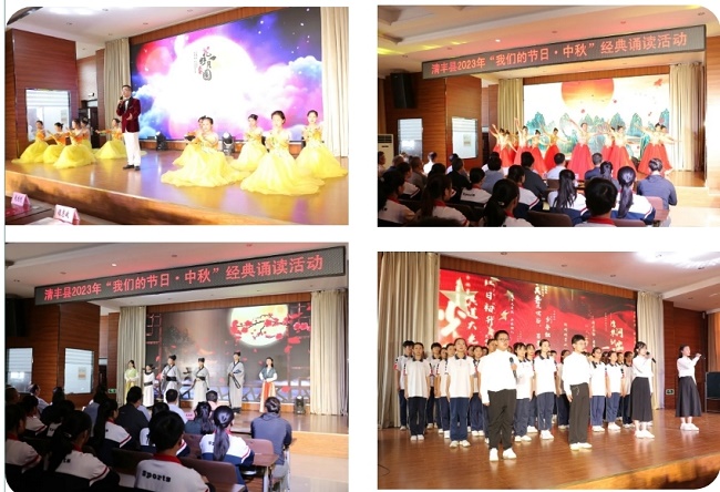 活动中,参加诵读的师生代表激情诵读《诗词连诵》、《春江花月夜》、《月亮伴随着我》、《就是那只蟋蟀》、《水调歌头》、《思乡曲》、《我骄傲我是中国人》、《灯火里的中国》、《黄河颂》、《少年中国说+强国有我》等经典曲目,在优美的诗词韵律中,深度挖掘中华传统文化内涵,进一步引领全县人民提升对中国传统文化的认知和尊重,不断增强文化自信和爱国主义情感。