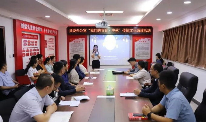 海上生明月,天涯共此时。为传承弘扬中华民族优秀传统文化,9月12日,县委办公室开展“我们的节日·中秋”传统文化诵读活动,全体干部职工齐聚一堂,咏读经典,唱诵诗歌,共叙中秋佳话。